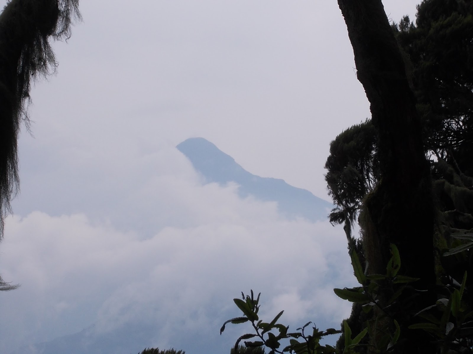 Hier sieht man im Hintergrund den nur wenige Meter höheren Hauptgipfel, welcher sich komplett auf kongolesischem Gebiet befindet. Leider erlauben die ugandischen Guides keine Exkursion dort hinüber |